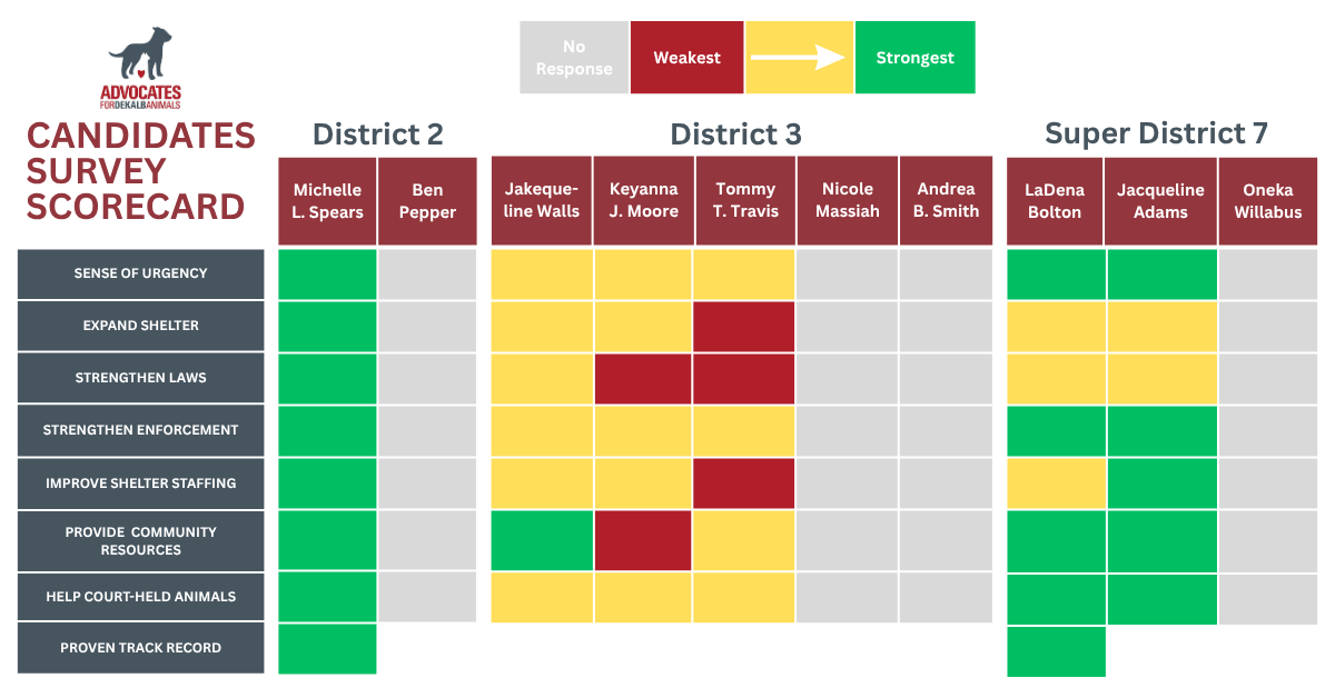 DeKalb voters care about animal welfare - homeless, mistreated, and overbred animals. It’s important to voters to understand how DeKalb County candidates will address their concerns. Successful candidates in this election cycle will hold critical decision-making power to effect changes related to the animal crisis.